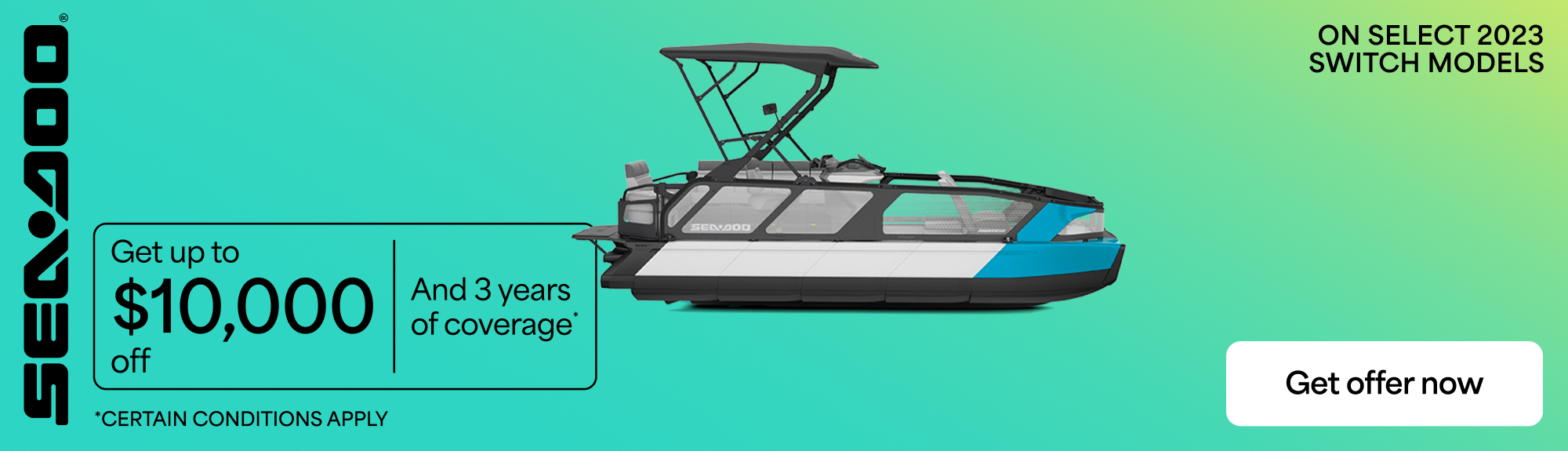 Get rebates up to $10,000 and 3 years of coverage on select 2023 Sea-Doo Switch models