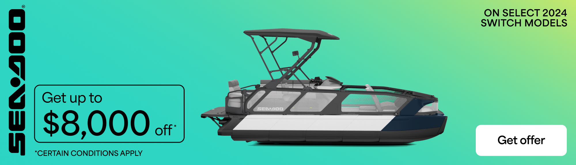 † Rebate up to $8,000 on 2024 Sea-Doo Switch models: Consumers who purchase a 2024 Switch Sport or Base 18', 19' or 21' are eligible to a $8,000 rebate. Consumers who purchase a 2024 Switch Cruise or Limited 18', 19' or 21' are eligible to a $7,000 rebate. Consumers who purchase a 2024 Switch 13' or 16' are eligible to a $4,000 rebate.